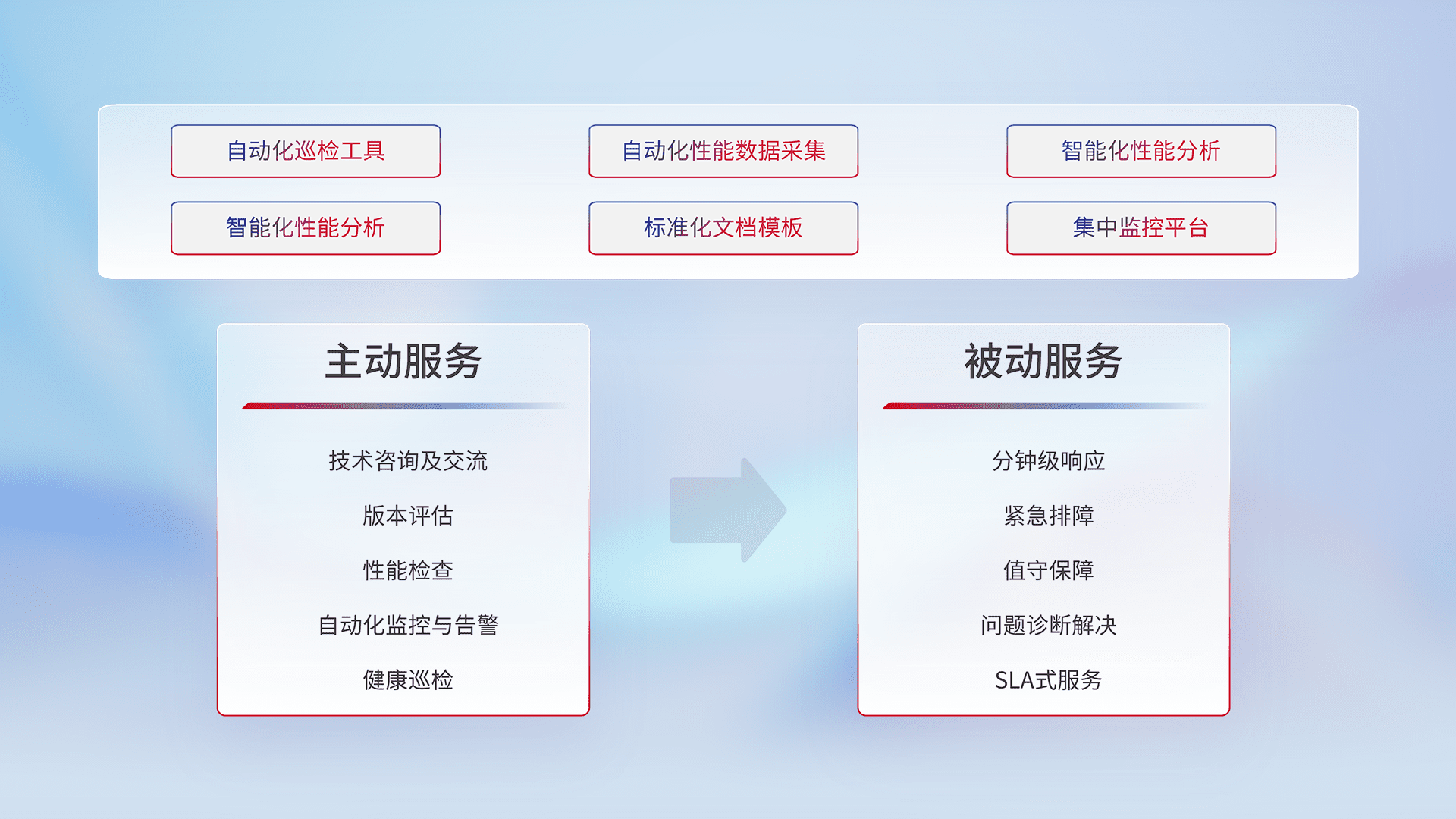 智能化工具和标准化文档,,保障服务质量,,,提供主动服务(包含技术咨询、、、、版本评估、、、性能检查、、自动化监控与告警、、、健康巡检)和被动服务包含(分钟级响应、、、、紧急排障、、值守保障、、、、问题诊断解决、、、、SLA服务)。。